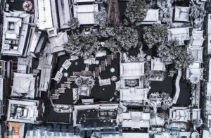 The photo was captured in Hangzhou, Zhejiang Province, China, by a photographer known for his creatively deceptive aerial shots. Taken from a helicopter, the image showcases dozens of decommissioned buses arranged in perfectly neat rows inside a storage facility. From high above, the massive buses shrink into tiny, toy-like rectangles, tricking the mind into misjudging their size and purpose.