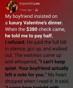 Valentine’s Day had always carried special meaning for me, even in the smallest ways. That evening, my boyfriend surprised me with a reservation at one of the most elegant restaurants.