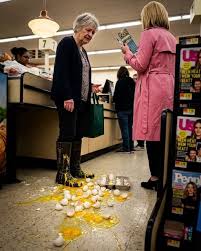 She stormed out in a fury, hurling insults over her shoulder and hopping around the egg mess she had caused as though she still couldn’t bear to touch the consequences of her own actions.