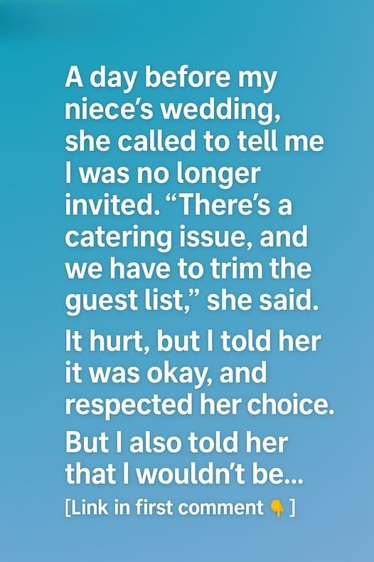 She explained that due to a last-minute catering issue, I was no longer on the guest list. Her words stung more than I anticipated, like a door I had always assumed would be open had quietly closed.