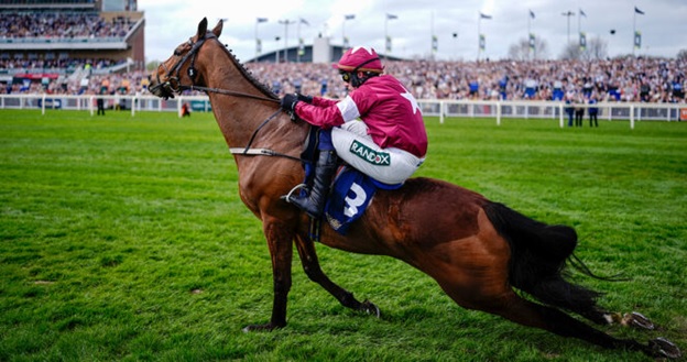 The final moments of Gold Dancer’s race have left viewers shaken, after the young horse dragged his hind legs across the finish line before collapsing shortly afterward at the Aintree Festival.