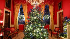The Blue Room holds an impressive 18-foot fir tree from Sidney, Michigan. Decorated in soft ivory, deep navy, and gold, the tree serves as a tribute to Gold Star families. It features 420 light strands, 3,000 feet of ribbon, and unique lithophane ornaments featuring each state’s bird and flower.