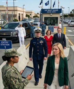 The officer tapped his tablet once, then twice. He looked up, his expression hardening. “I’m sorry, ma’am… you’re not on Commander Cartwright’s guest list.”