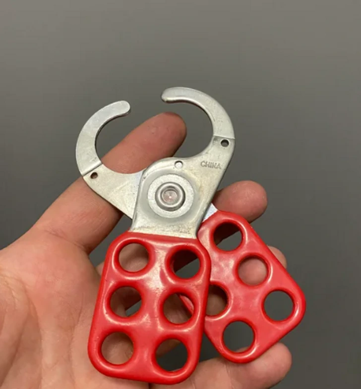This specialized clamp is a gang lock, a safety tool in electrical work that prevents equipment from being switched on while multiple people are working.