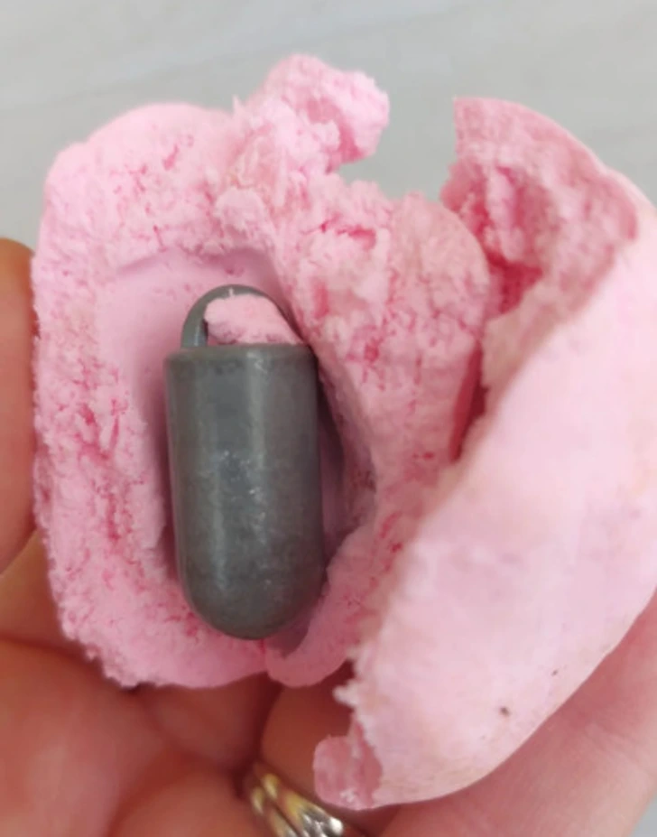 A small metallic piece surrounded by clay? It’s a worm weight, made of lead or tungsten, used in fishing.