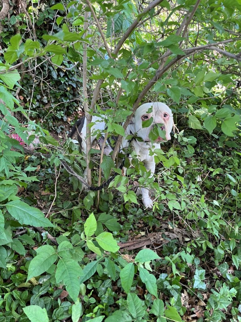 Hidden deep in the bushes, tied to a small tree by a worn leash, was a dog who had likely been trapped there for three entire days. He had less than a foot of room to move. Nearby lay a single empty pink plastic bowl—the only indication that someone may have left him intentionally. No shelter, no food, no water, no comfort. Just a dog, confined in silence, waiting for someone—anyone—to notice him.