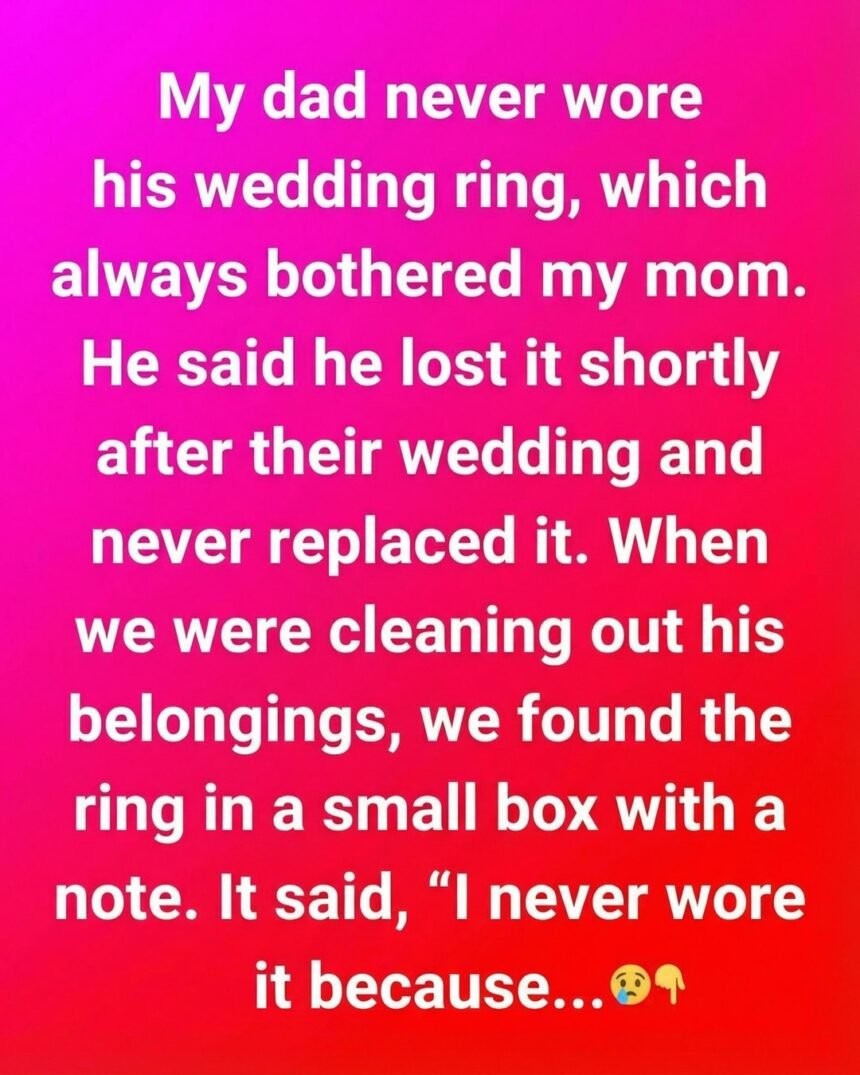 My dad never wore his wedding ring. It puzzled my mom for years. He always claimed he’d lost it early in their marriage and never bothered to replace it. But while cleaning out his things, we found the ring tucked safely inside the little box, wrapped in a soft cloth, accompanied by a short note.