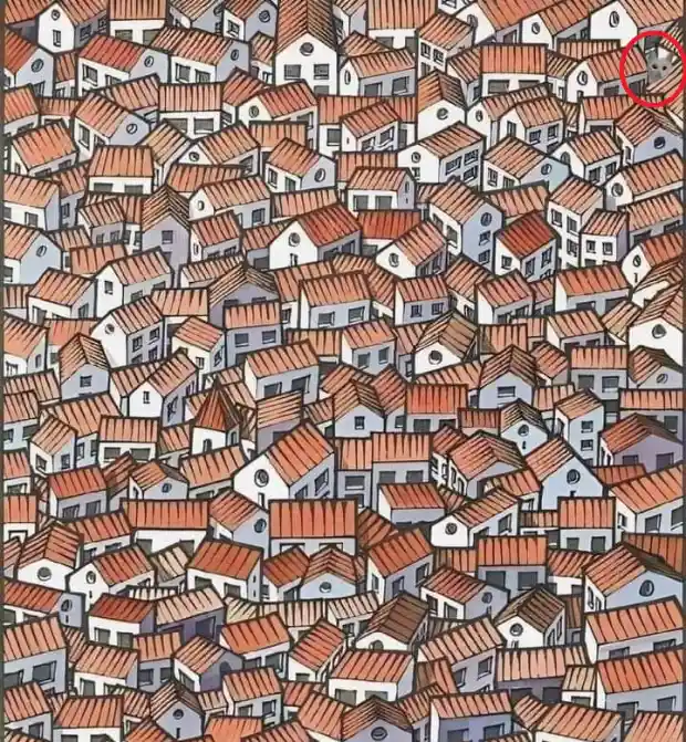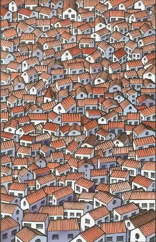 At first glance, it seems completely ordinary. A quiet village, rows of rooftops, chimneys, and tiles—nothing unusual jumps out. Yet this calm scene is exactly what makes the challenge so tricky. Hidden in plain sight is a cat, perfectly camouflaged, waiting to test your powers of observation. Many viewers scroll past it entirely—until they finally see it.