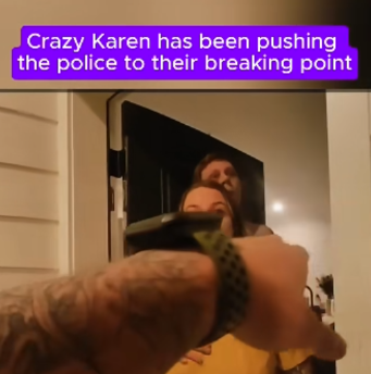 A video that has since gone viral shows a woman, quickly labeled “Crazy Karen” by online viewers, locked in a fierce standoff with police officers right on her doorstep. The footage—captured on bodycam or a bystander’s phone—reveals a visibly strained officer pointing firmly at the woman, who appears partially restrained by a man standing behind her.