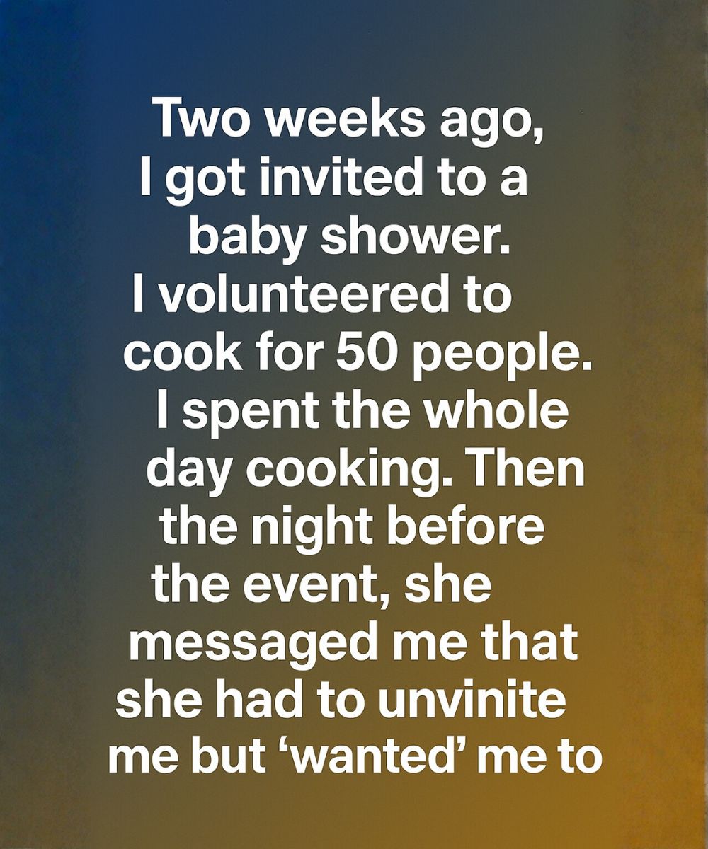 One day, I was excitedly preparing a feast for fifty people; the next, I was “uninvited,” yet still expected to deliver all the food. It felt unfair, almost like a test—and sometimes, the people closest to us reveal sides we never expected.
