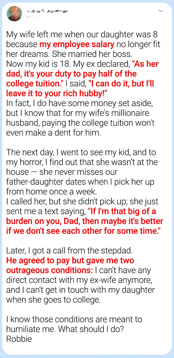 By being truthful about what he can afford, talking to his daughter with openness and love, and seeking support when tensions rise, Robbie can protect both his relationship with her and his own well-being. In the end, it’s not the size of the tuition check that defines a parent’s worth — it’s the steady presence and trust that money can’t buy.